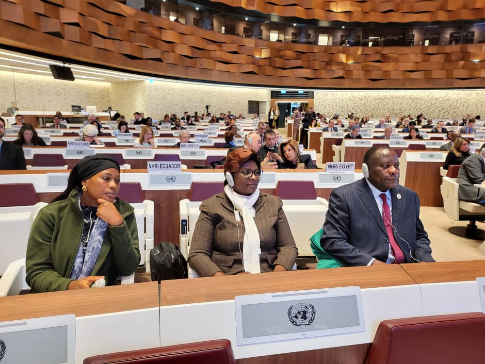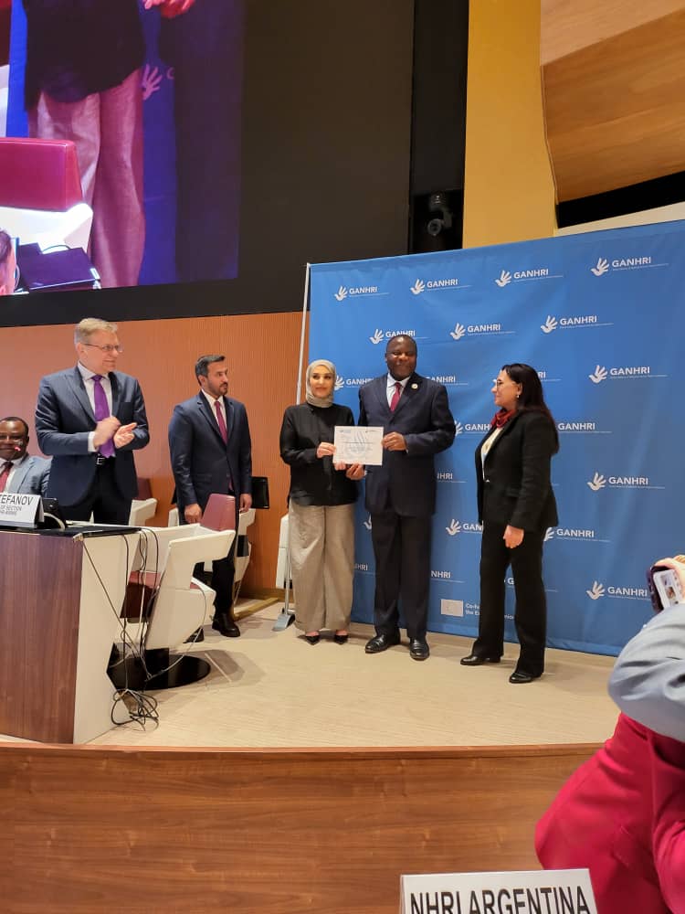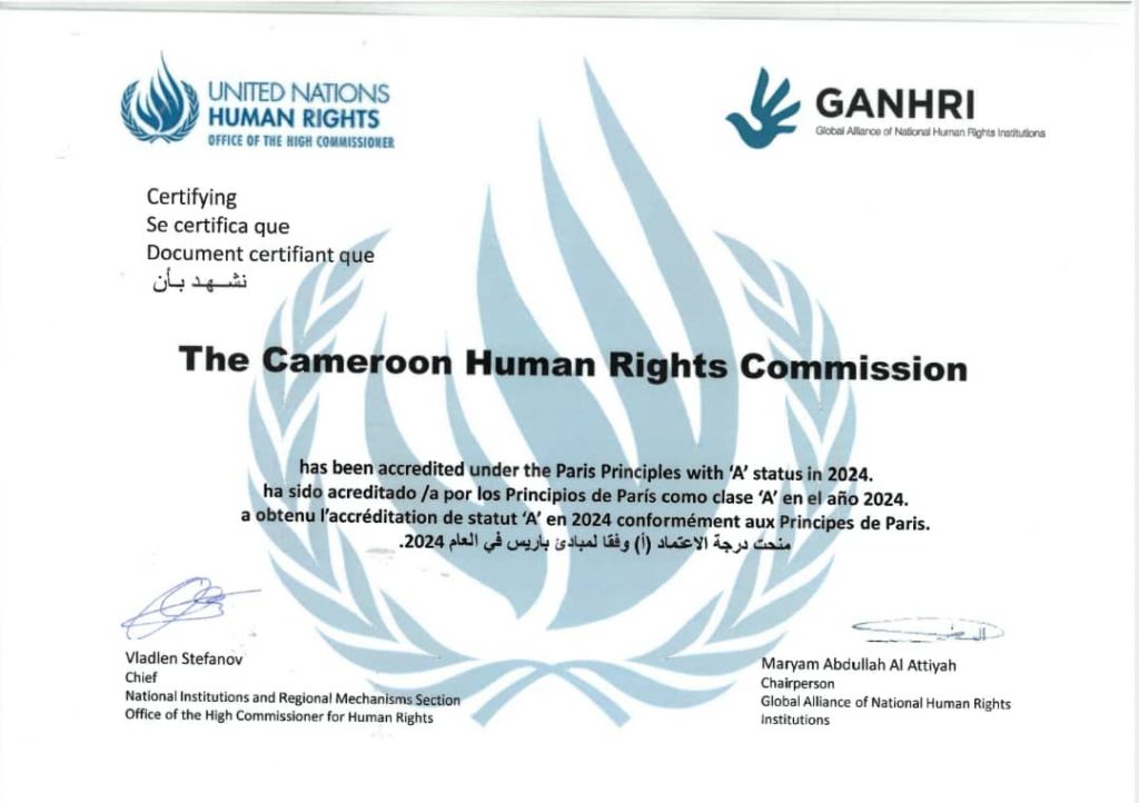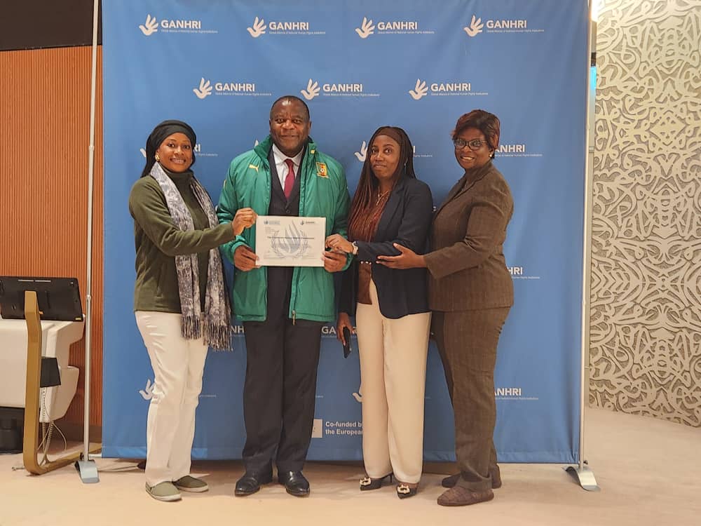Prof James Mouangue Kobila, officially received the certificate confirming the CHRC accreditation to A status. The award was presented by Mrs Maryam Abdullah Al Attiyah, outgoing Chairperson of the Global Alliance of National Human Rights Institutions (GANHRI) and Chairperson of the National Human Rights Committee of Qatar, who was joined by Mrs Amina Bouayach, incoming Chairperson of GANHRI and Chairperson of the National Human Rights Council of Morocco. This recognition was granted during GANHRI’s annual session, held from 10 to 12 March 2025.